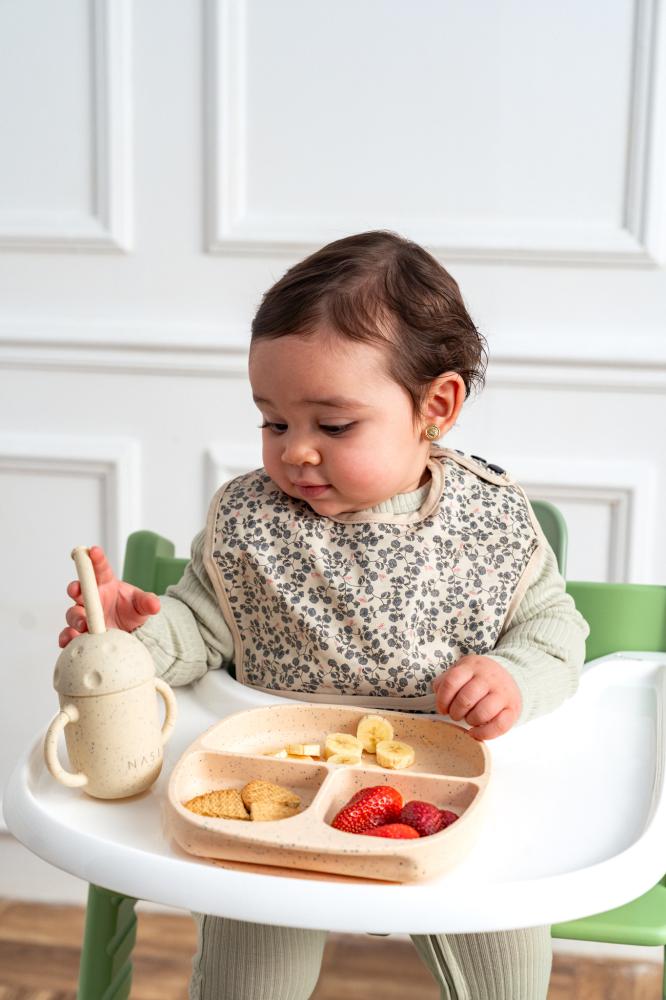 - مريلة السيليكون: تتميز بتصميم كلاسيكي يعكس مظهرًا أنيقًا وجذابا، تحافظ على شعور طفلك بالراحة والنظافة، كما تتميز بمقابض دائرية محكمة حول الرقبة وبمقاسات مختلفة لتثبيتها بشكل جيد، وجيب أمامي عميق يعد مثاليا لالتقاط بقايا الطعام.