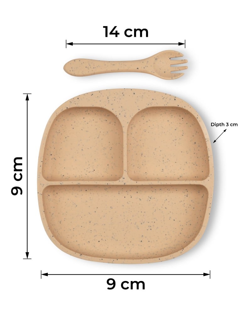 • صحن سيلكون للاطفال مع الشوكة مقسم ثلاث أقسام يتميز بعدة ألوان جذابة.